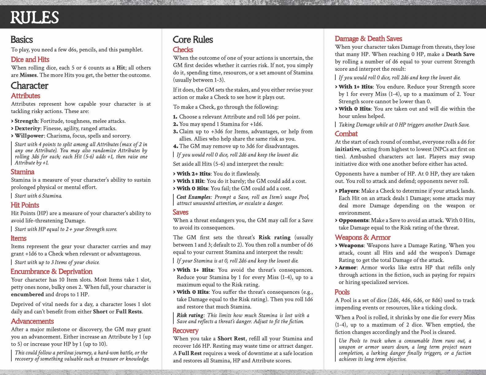 - Build dice pools from Attributes, by burning Stamina, or relying on Items and advantages to face danger