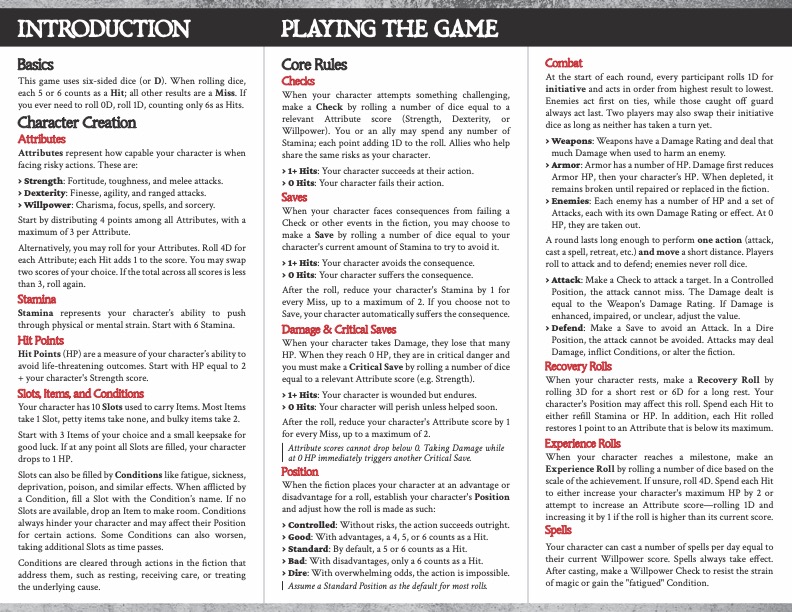 - Core d6 pool system: every 5–6 is a Hit; the more Hits, the better the outcome
