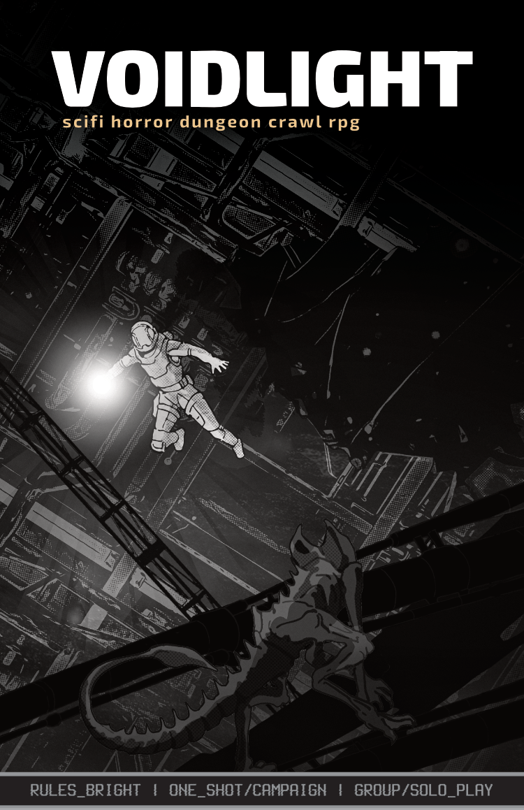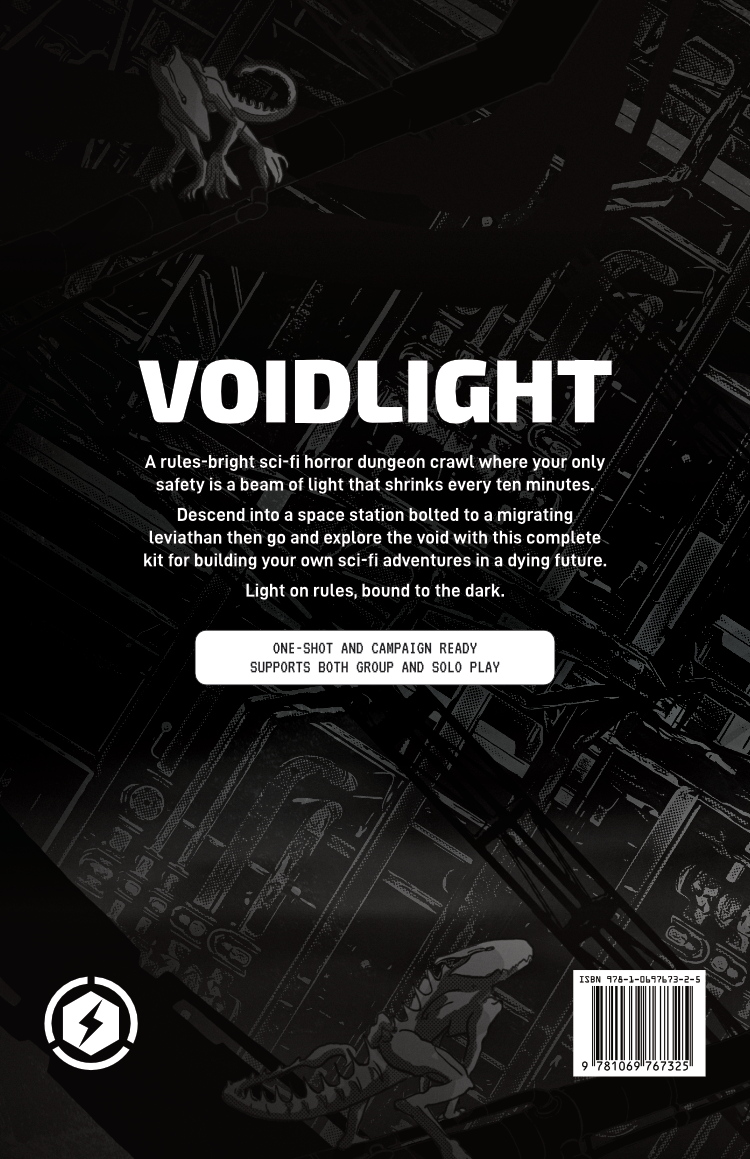 A rules-bright sci-fi horror dungeon crawl where your only safety is a beam of light that shrinks every ten minutes. Descend into a space station bolted to a migrating leviathan then go and explore the void with this complete kit for building your own sci-fi adventures in a dying future.
