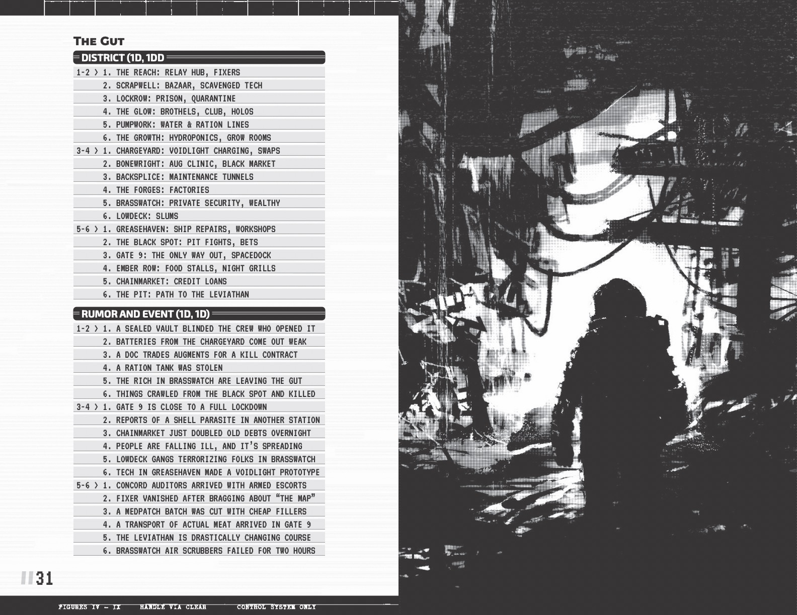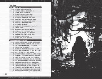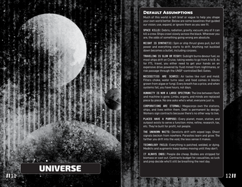 - 70 rolling tables for characters, NPCs, districts, rumors, factions, events, sectors, locations, loot stashes, creatures, ships, ship names, and more.